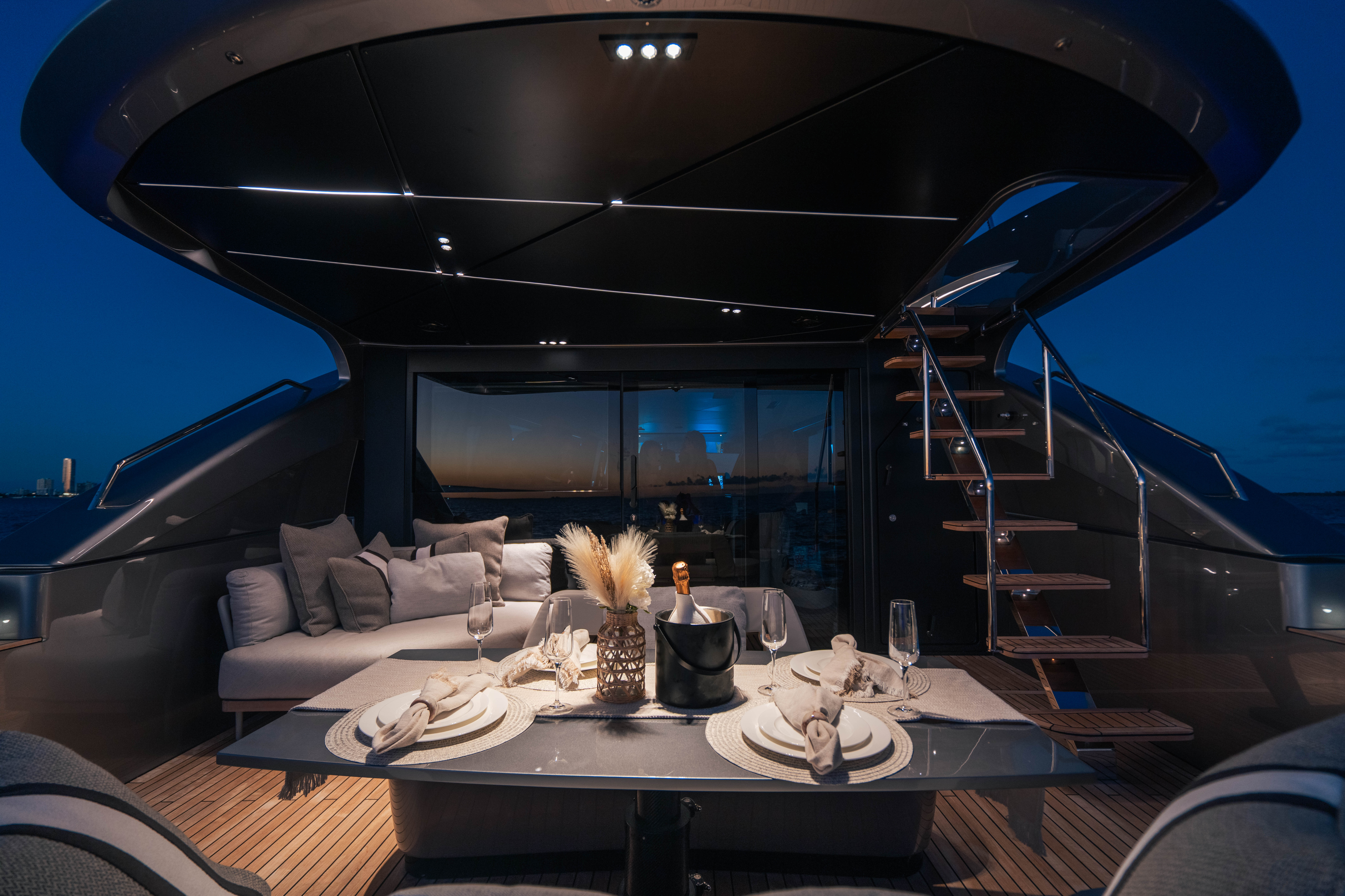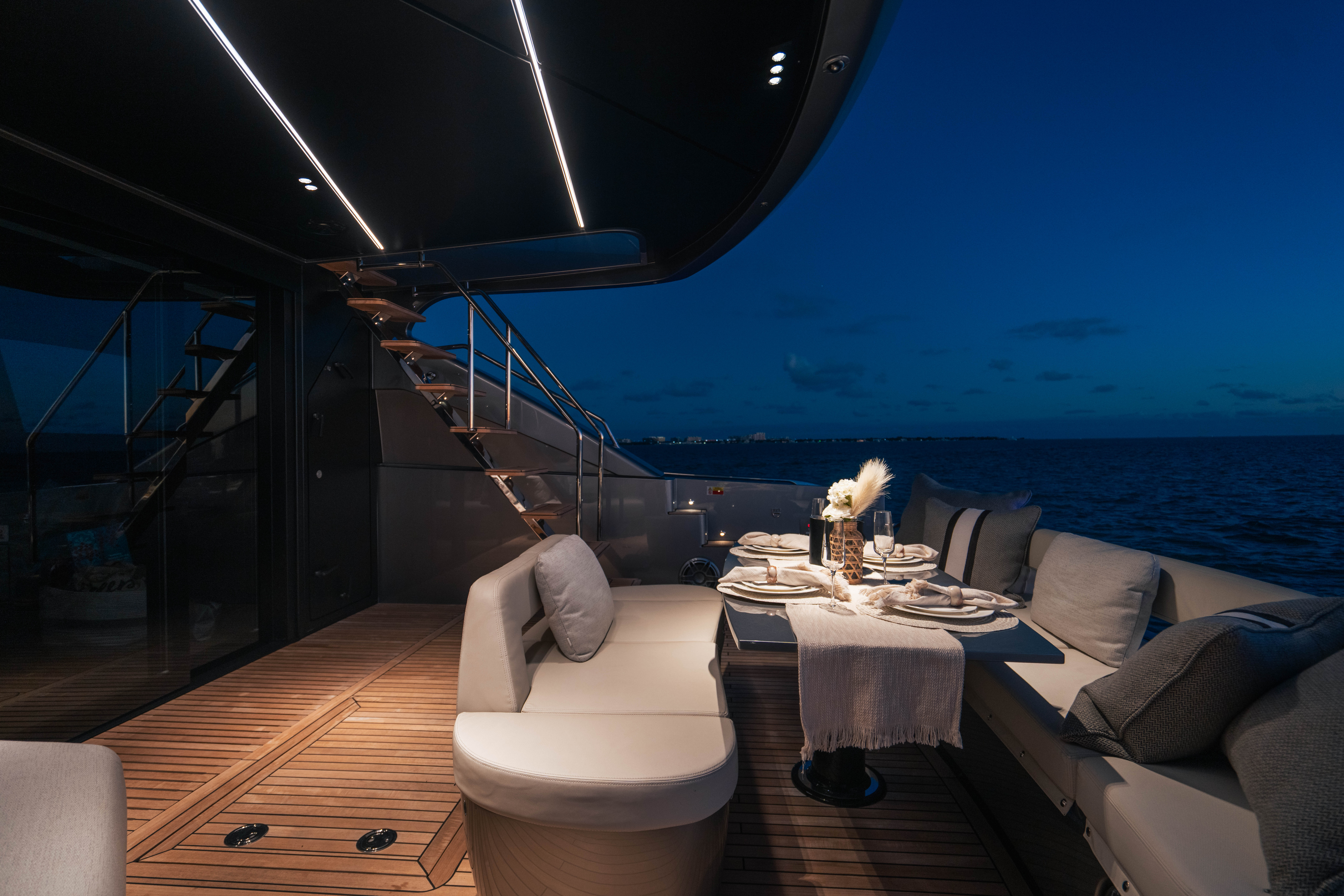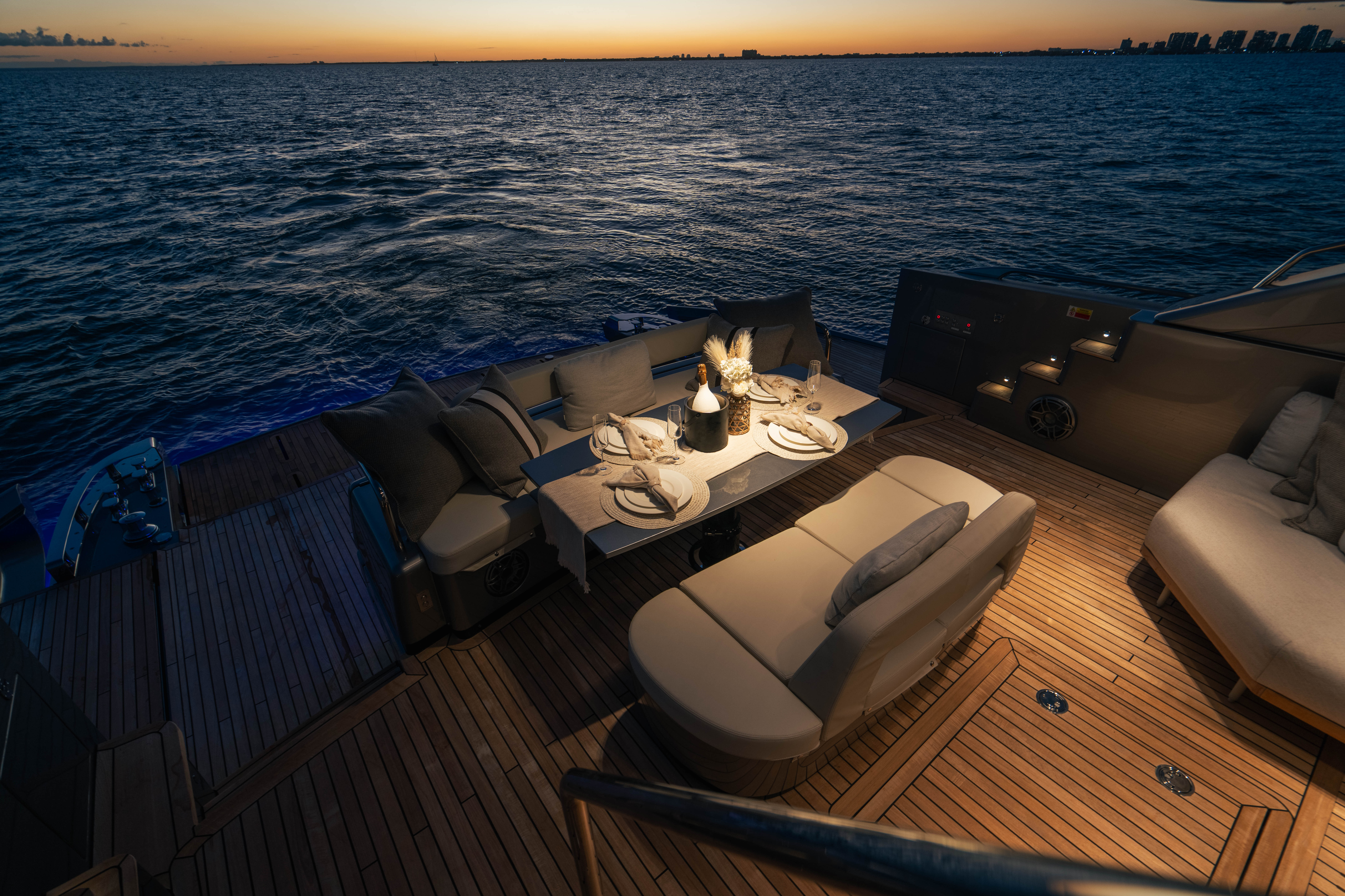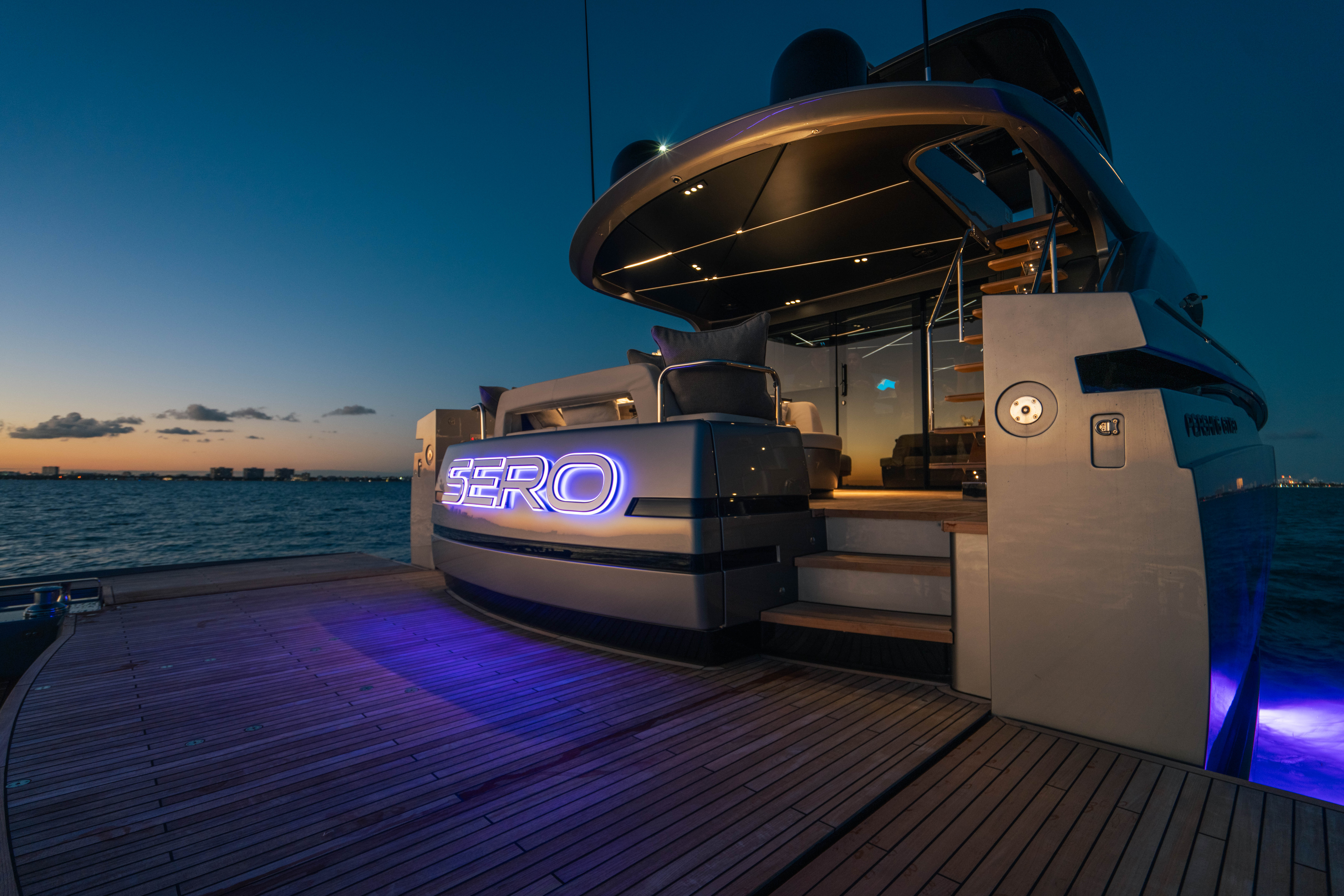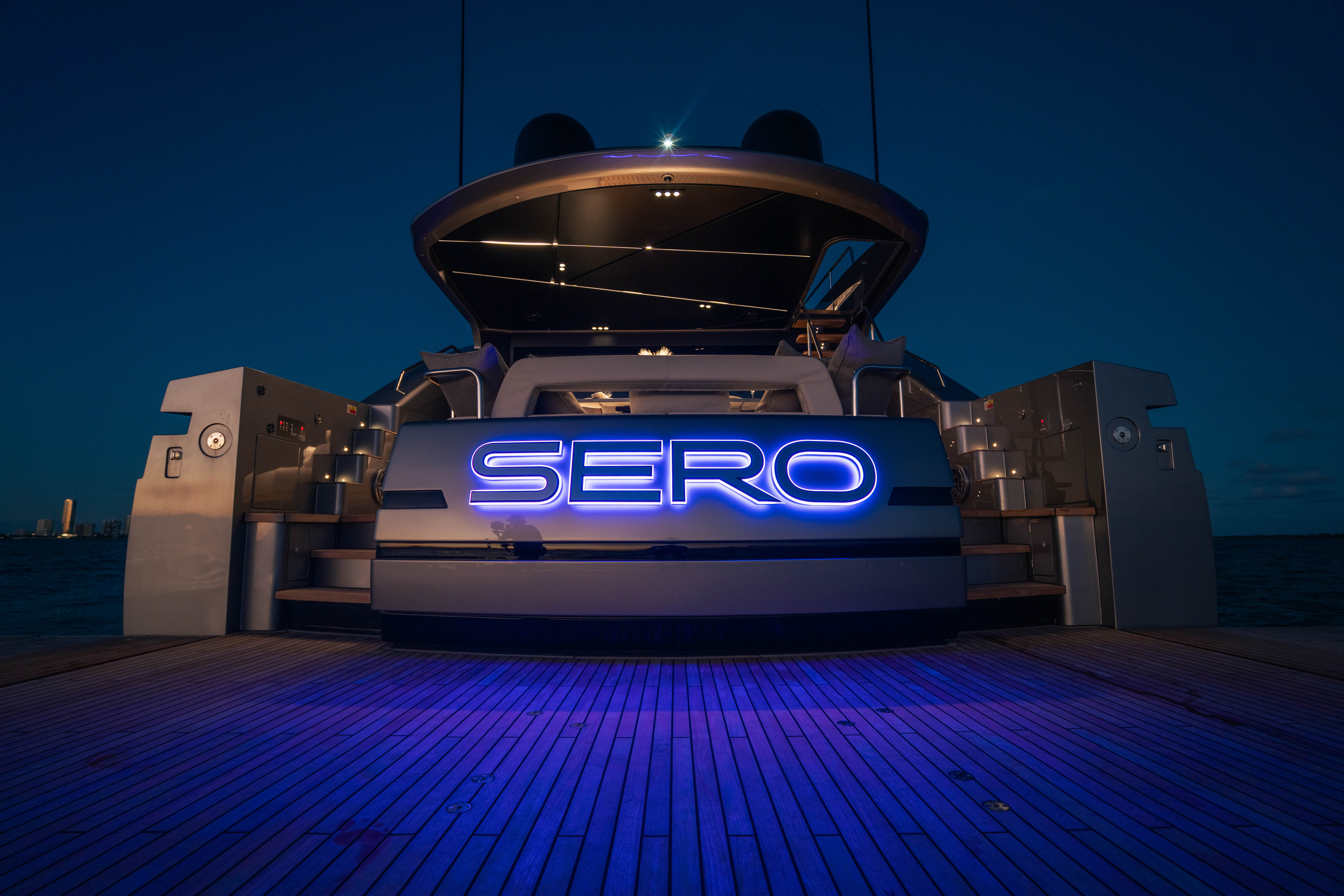 Sero is the newest and most dynamic yacht in the fleet. The Pershing GTX80 pairs triple Volvo IPS power with a massive beach club, carbon fiber sundeck, and the aggressive Italian design Pershing is known for. Based in Montauk. Up to 12 guests.