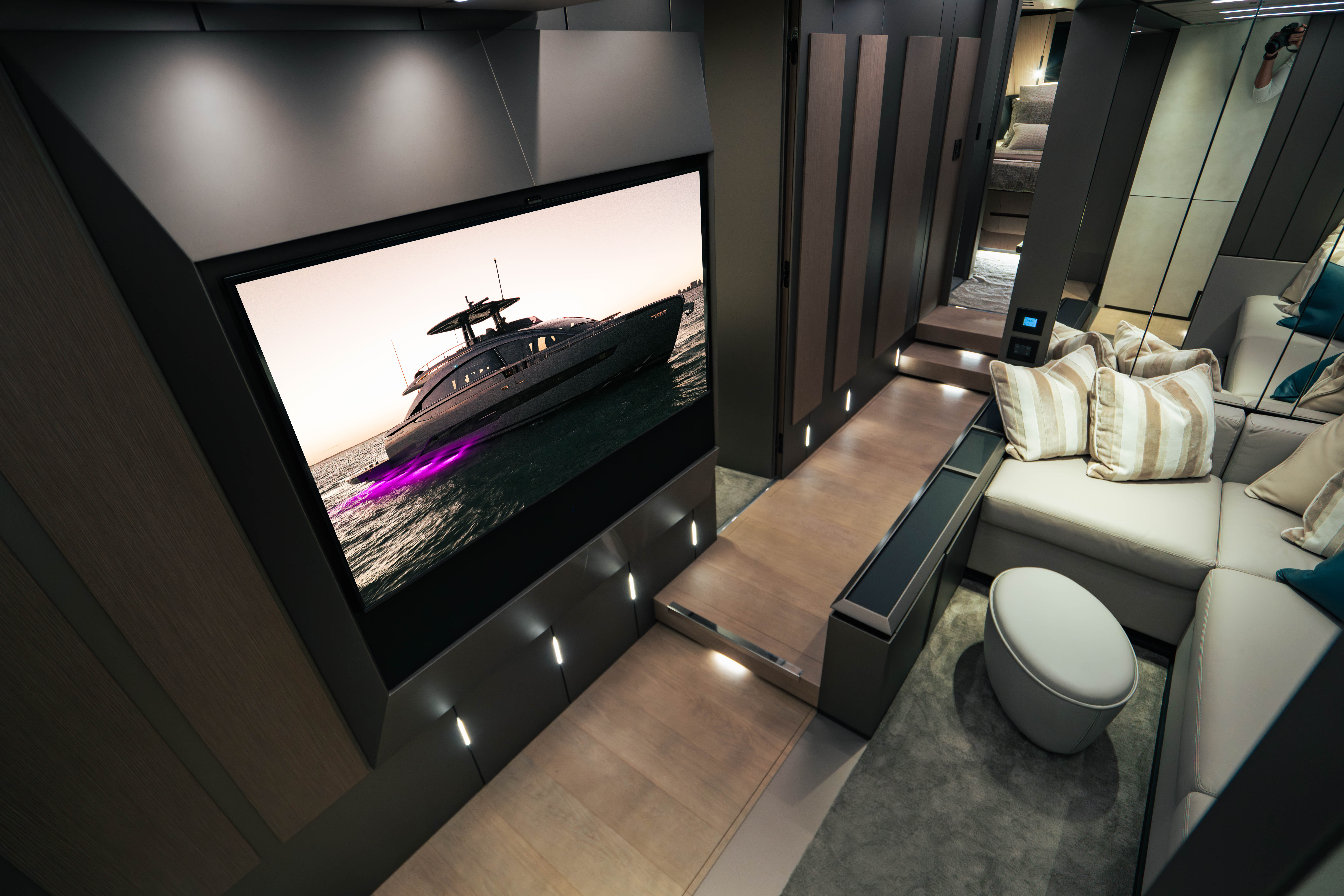 The beach club is the showpiece — a 300-square-foot platform that includes a hydraulic swim platform, fold-out terraces on both sides, and room for a tender and jet ski. Above, the carbon fiber sundeck delivers panoramic views and lounge space that feels more like a rooftop than a boat. The main deck galley flows directly into the cockpit, making the indoor-outdoor transition seamless. Below deck, three ensuite staterooms accommodate your group in privacy and comfort. A Seabob, Bote swim platform, and Bote hangout chairs are ready when it’s time to play.