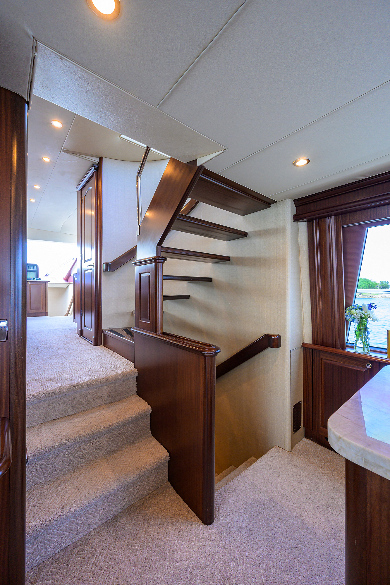The layout is classic pilothouse — both upper and lower helm stations sit on centerline for excellent visibility, with the galley and dining area at pilothouse level so everyone can enjoy the view. The main salon stretches aft to the cockpit, and below deck, four ensuite staterooms include a full-beam master with a private entrance and oversized head. Separate crew quarters aft accommodate a professional team of three.